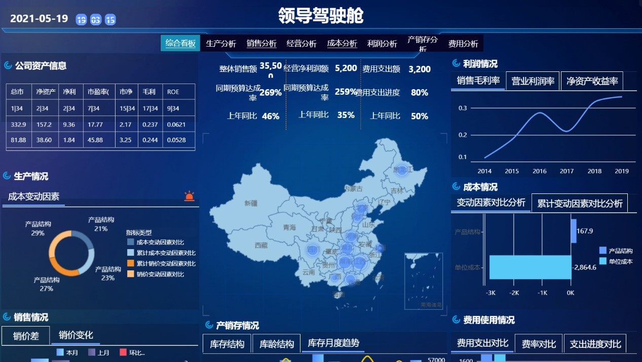 这个层级主要是战略管理驾驶舱,面向的是集团领导以及事业部各层级的领导。通过分析图形进行多指标、多维度的展现,反应内部和外部总体经营状况和趋势。