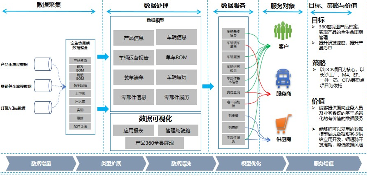 包括产品研发、制造、整车线上线下实销、维修等数据,都会进入产品数据中心进行统一处理,形成车辆的360°产品档案,实现产品全生命周期管理,提升研发速度,提高产品质量。产品数据中心可以提供面向业务人员及业务系统的基于场景化的高价值数据服务,把可以复用的数据模型做成数据服务提供给应用开发,缩短开发周期,降低数据风险。