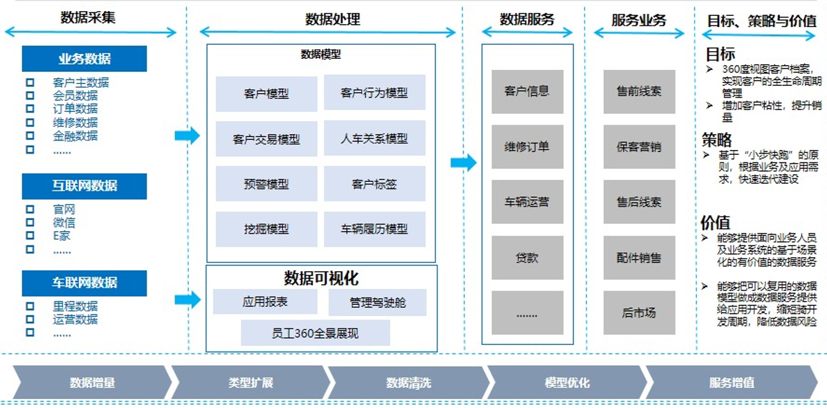 客户数据中心将各个维度的数据汇总,包括内部形成的客户数据,以及车联网数据等,建立统一的客户模型,包括行为模型、关系模型、客户标签等,构建360°视图客户档案,实现客户的全生命周期管理,增加客户粘性,提升效率。