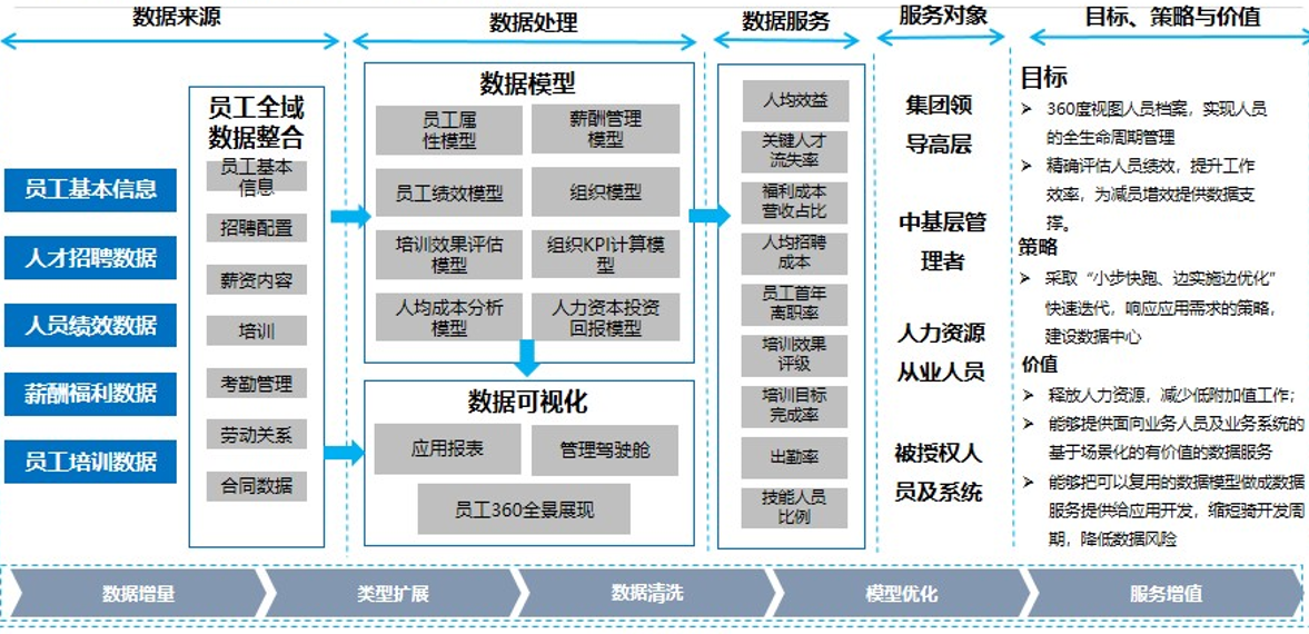 人力数据中心主要目的是满足对员工的透明化考评,提升考核的可见度,包括员工基本信息、人才招聘信息、人员绩效信息、薪酬福利信息、员工培训信息等,释放人力资源价值,减少低附加值工作。