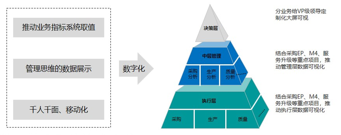 基于策略性目标,福田汽车做了三个层次的可视化展现形式,分别为决策层、中层管理和执行层。分对象梳理展示需求,为经营层各领导提供可下钻分析、直抓问题点的数据支持。同时,结合重点项目推动业务的数据可视化,提升数据透明度。