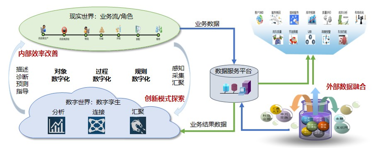 在数据赋能下,福田汽车开始了业务创新,其目的是构建一个跨越孤立系统的数据服务平台,通过对象数字化、过程数字化、规则数字化建设,打造福田汽车数字化世界,并结合外部数据,探索数据创新模式。