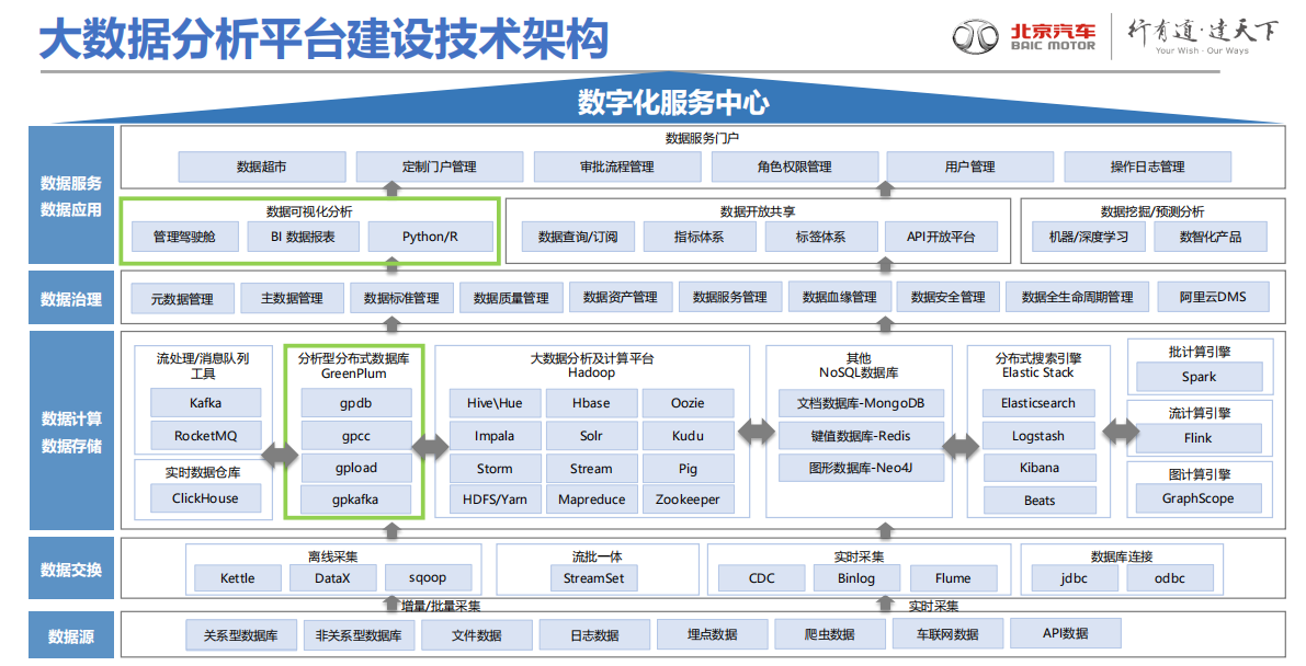 北汽股份大数据分析平台作为数字化服务中心的技术支撑,整体技术架构平台按照行业内标准的多层次结构设计建设: