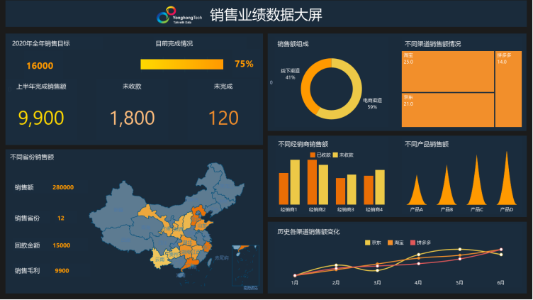 优秀的数据可视化应当是 “信息密度” 与 “视觉舒适度” 的平衡艺术,永洪 BI 模板在这一点上展现出专业水准。其设计团队融合认知心理学与视觉美学原理,通过色彩体系、布局逻辑与交互设计,让复杂数据变得直观易读。
