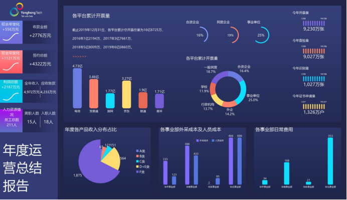 永洪BI提供了近40种数据图表,从基础的柱形图、趋势图、散点图、饼图,到更高级的可视化形式,足以满足绝大多数分析场景的需求。你还可以利用自由式表格组件制作复杂的中国式报表,支持多源数据关联和灵活的格间计算。