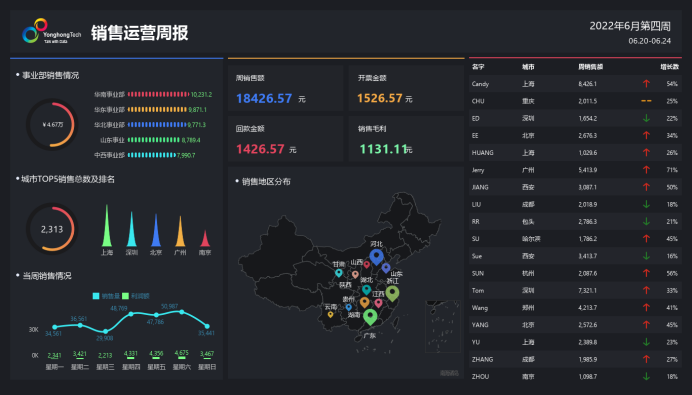 永洪bi数据可视化工具提供了丰富的可视化组件——从基础的折线图、柱状图,到高级的热力图、桑基图、漏斗图,甚至支持3D模型和动态交互仪表盘。例如,市场部门通过永洪BI制作的用户画像仪表盘,能一眼看清不同区域、年龄段用户的消费偏好;管理层借助营收趋势动态图,可快速定位业绩波动的关键节点。这种“所见即所得”的呈现方式,让数据不再是冰冷的数字,而是能直接指导行动的“可视化洞察”,极大降低了决策门槛,让业务人员也能轻松参与数据分析与决策过程。