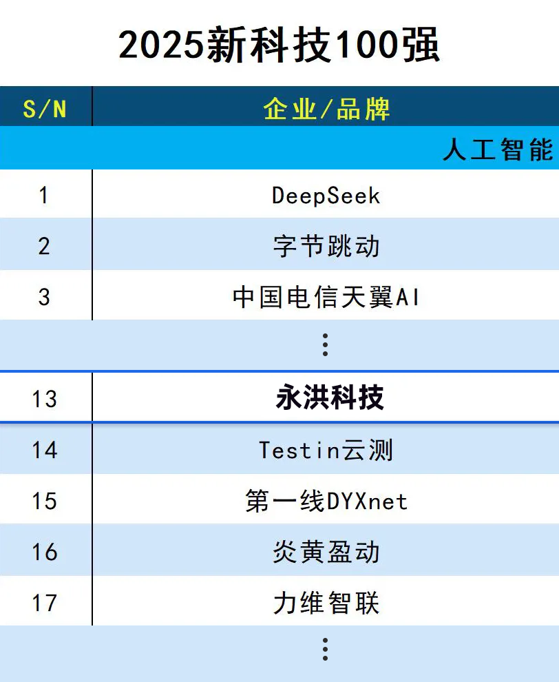 在这一背景下,永洪科技入选《2025新科技100强》,位列人工智能赛道第13位,凸显了市场对其实践成果的高度认可。